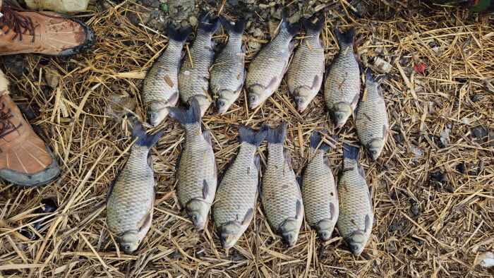 새벽 5시30분경 거대한 얼음 무더기가 밀려오며 더 이상 낚시가 불가능해졌을 때야 비로소 의자에 몸을 기댔다. 아침에 확인한 조과는 실로 놀라웠다. 월척만 무려 12마리 여기에 9치 1마리를 더해 총 13마리의 붕어를 만날 수 있었다. 평균 씨알은 32~34cm로 준수했다.