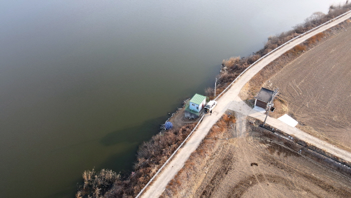 드론으로 촬영한 죽암수로 전경. 주로 상류 샛수로에서 낚시가 이루어지나 추위에 결빙돼 본류권 좌안에서 낚시를 했다.