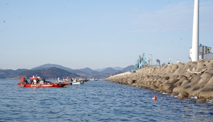 낚싯배에 올라탄 것은 오전 6시50분 무렵. 이제 막 어둠이 가실 타이밍이었다. 낚싯배가 팔포항을 벗어나자 화력발전소 굴뚝에서 뿜어져 나오는 수증기가 눈에 들어왔다. 장정규 씨는 “굴뚝에서 나오는 수중기를 보면 바람 세기를 알 수 있습니다. 오늘처럼 수직으로 수증기가 올라가면 바람이 양호한 상황이고 좌우로 꺾여 올라가면 강풍이 분다는 신호죠”라고 말했다.
