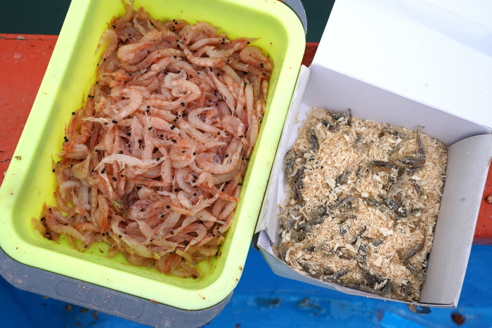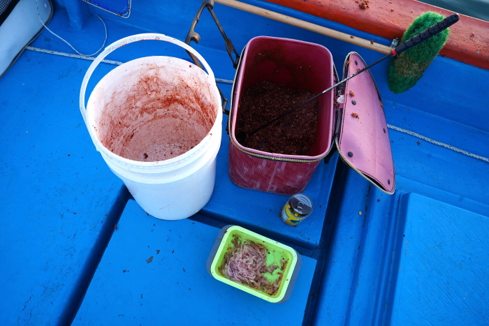 현지꾼들의 선상 찌낚시용 밑밥통. 사용과 세척이 용이한 플라스틱통(왼쪽)을 많이 사용한다.