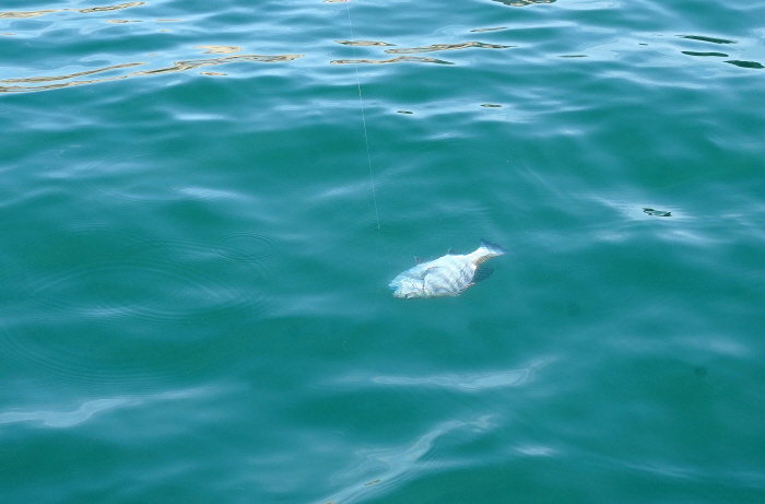 이날은 우리 배뿐 아니라 다른 낚싯배들도 사정은 동일했다. 다행히 오후 12시 무렵 장정규 씨가 50cm에 달하는 굵은 씨알을 올렸는데 삼천포화력발전소 선상 찌낚시에서는 종종 올라오는 씨알이었다.
