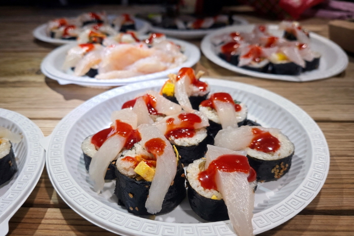 철수 후 서토정 선장이 김밥에 볼락회를 얹어 야식으로 제공했다.