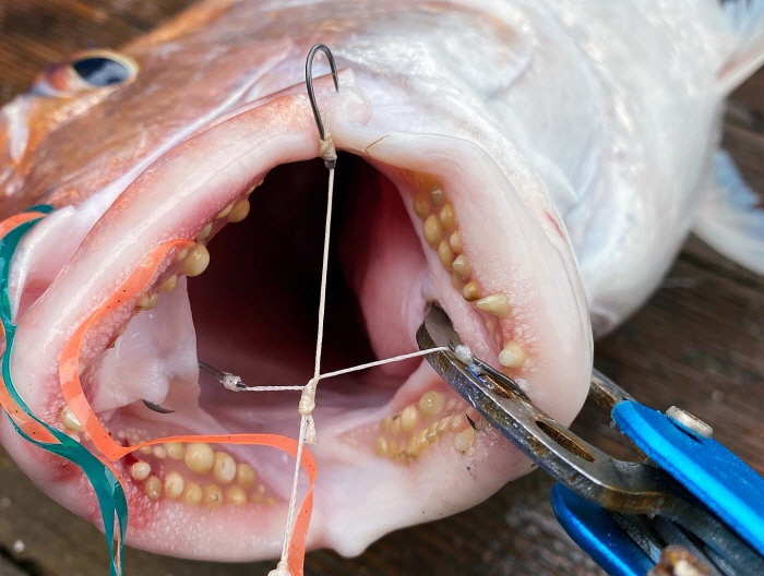 고모쿠 도칸 타이라바의 바늘이 참돔 입에 완전히 박혔다.