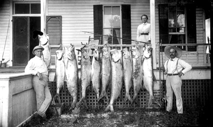 1890년, 플로리다주 사라소타(Sarasota)의 숙소 앞에서 타폰 조과를 자랑하는 낚시인들.