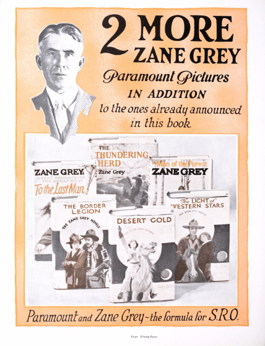 영화화된 Zane Grey의 소설은 100편이 넘는다. 1925년 영화화된 소설을 알리는 포스터.