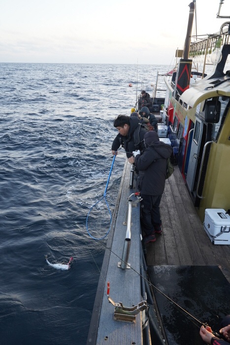 대구가 히트되면 대끝을 툭툭 치는 형태로 입질이 온다. 수심 100m에 가까운 곳에서 물다보니 입질이 엄청나게 세게 들어오지는 않는다. 일단 뭔가 묵직하고 툭툭 치는 약한 느낌이 왔다면 대구가 히트된 것이다. 이때는 전동릴을 작동시켜 천천히 끌어올린다. 워낙 오랜 시간이 걸리기 때문에 낚싯대는 손에 들고 있지 말고 받침대에 거치해 끌어내는 게 수월하다. 이때 좋은 낚싯대가 허리가 부드러운 중질대다. 대구는 입이 크고 이빨이 날카롭지만 의외로 과격하게 먹이고기를 물지 않는다.