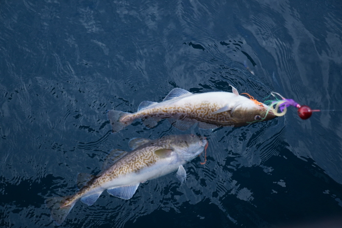 수면으로 끌려 나온 대구. 아랫바늘과 윗바늘을 모두 물고 나왔다.