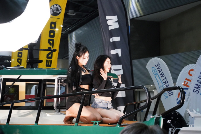 록키 부스에 전시한 보트에 모델들이 올라 포즈를 취하고 있다.