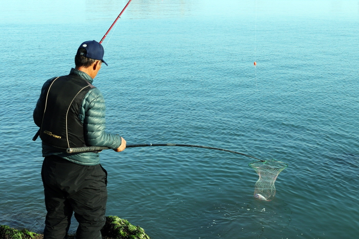 갯바위에 자리를 잡고 물때를 확인했다. 중썰물이 흐르는 상황. 1호 구멍찌로 채비 후 밑밥을 뿌리자 예상대로 잡어가 몰려들었다. 크릴을 바늘에 꿰어 최대한 원투한 후 채비를 가라앉히고 끌어당기는 식으로 낚시를 했다. 예상보다 빨리 입질이 들어왔다. 황성준 씨가 힘차게 챔질하자 낚싯대가 활처럼 휘었다. 그런데 금방 맥이 풀렸다. 알고 보니 숭어가 바닥에서 입질한 것. 이맘때는 숭어가 마치 감성돔처럼 바닥에서 입질하는 경우가 잦은데, 숭어의 덩치가 커서 손맛 보기는 좋지만 아쉬운 마음이 드는 건 사실이었다.