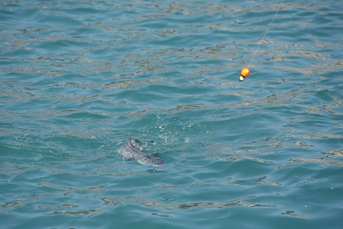큰 숭어가 걸려 나오고 있다. 이맘때면 마치 감성돔처럼 바닥에서 입질해 낚시인의 간담을 서늘하게 만든다.