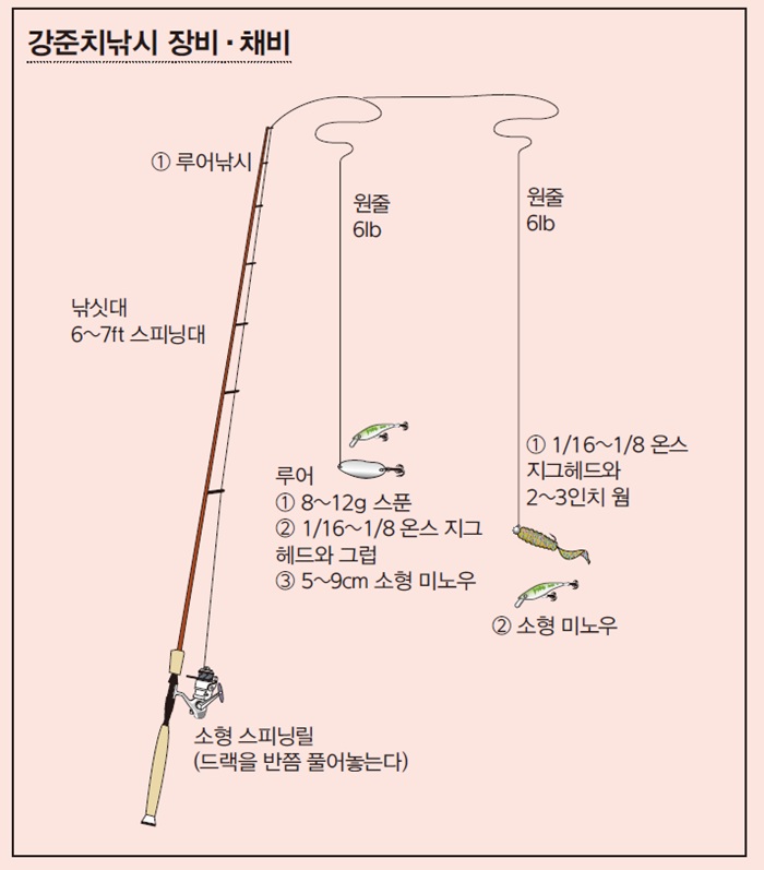 루어낚시는 6lb 나일론 원줄을 사용한다. 합사라면 0.6~0.8호 내외를 쓰고 2호 내외의 목줄을 원줄과 연결해서 쓴다.