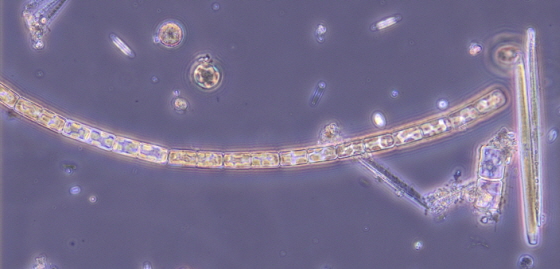 공지천의 바닥을 살펴 보니 돌표면을 온통 부착조류가 덮고 있어 마치 카페트를 깔아 놓은 듯 털 모양의 부착 생물이 잔뜩 붙어 있는 전형적인 하천의 부영양화 현상이다. 부착조류가 이렇게 과다번성하는 것은 수질이 나쁜 곳에서 나타나는 수생태계에 매우 해로운 현상이다. 채취하여 현미경으로 조사하니 대부분 ‘멜로시라’라는 흔히 출현하는 부착 규조류로서 원통형의 세포가 붙어 있어 실모양으로 성장하는 종류인데, 녹색이 아닌 갈색을 띠고 있어 광합성 생물로 보이지 않고 오물로 보일 수도 있는 종이다.