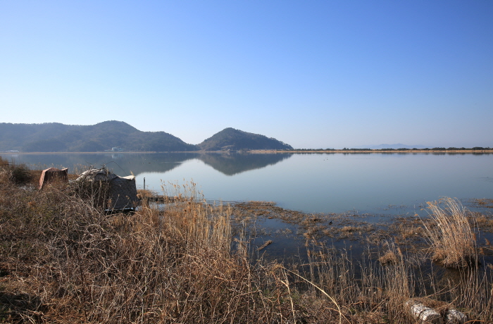 오후에 완도호에 도착해 이두수 씨와 함께 연안을 한 번 둘러 보았다. 방조제에서 상류를 봤을 때 우측 하류의 부들이 시작되는 자리가 마음에 들었다. 하지만 서풍과 북서풍이 교차로 불어 포기하고 좌측 상류에 자리를 잡았다. 좌측 상류는 서풍이 불면 등바람. 채비를 던지기도 수월하고 물결이 일지 않아 다른 곳보다 낚시하기 수월할 것으로 판단했다. 게다가 좌측 상류는 연안에 뗏장수초와 갈대가 발달해 지금처럼 산란에 임박하면 좋은 포인트가 될 것으로 보였다.