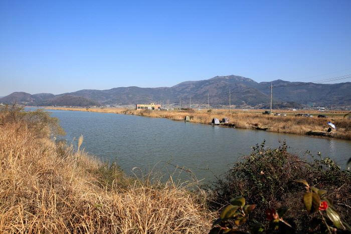방조제에서 상류를 봤을 때 우측 상류에 있는 배수장. 배수장 주변도 접근성이 좋아 많은 낚시인이 자리하고 있다.