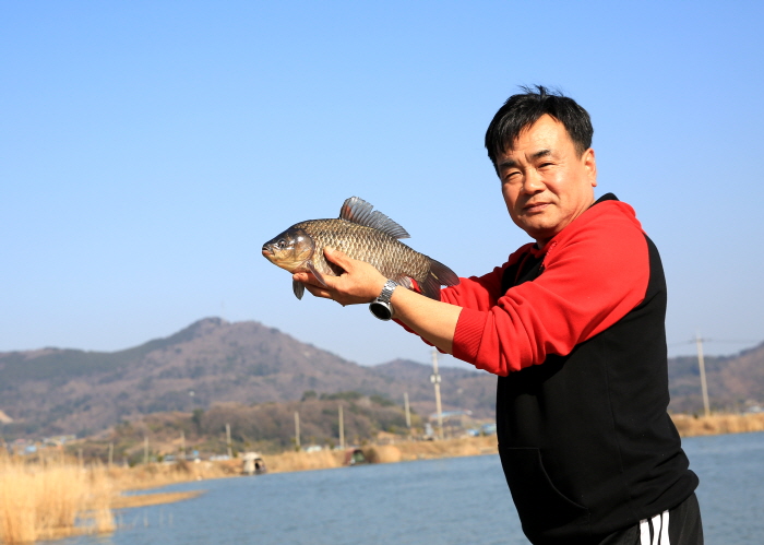 특별한 일이 없으면 매일 완도호에서 짬낚시를 즐기는 완도 현지인 이경민 씨가 오전에 낚은 월척 붕어를 보여주고 있다.
