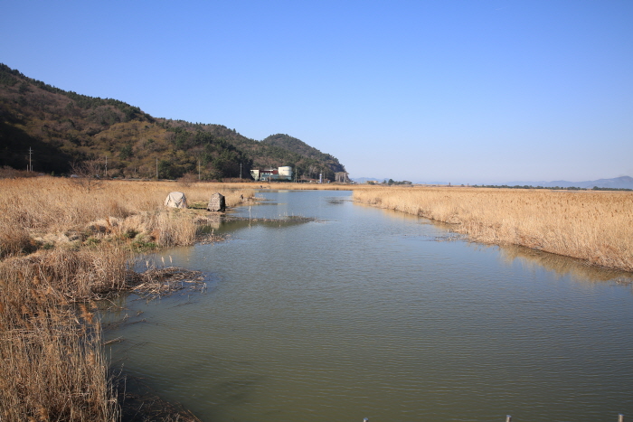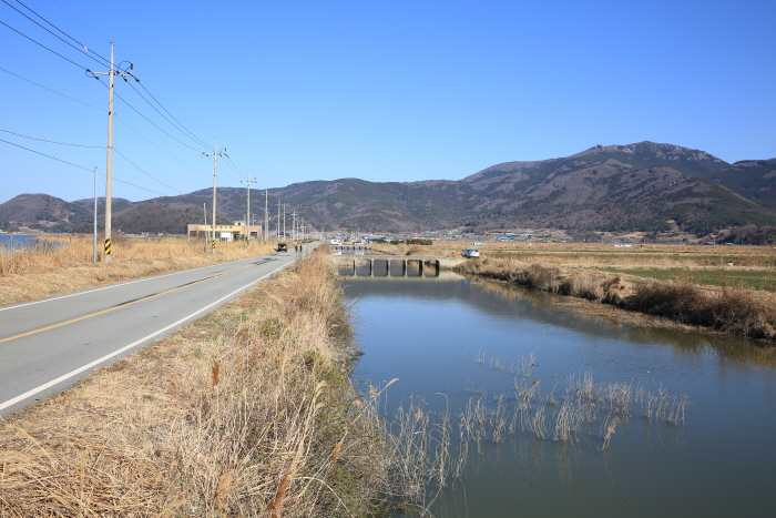 완도호 상류. 길을 사이에 두고 호수와 수로가 붙어 있다.