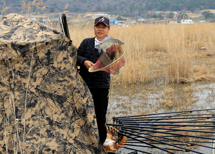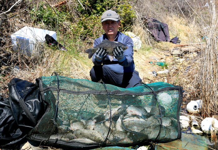 울산에서 온 이두수 씨가 장박낚시로 거둔 월척 붕어 조과를 보여주고 있다.