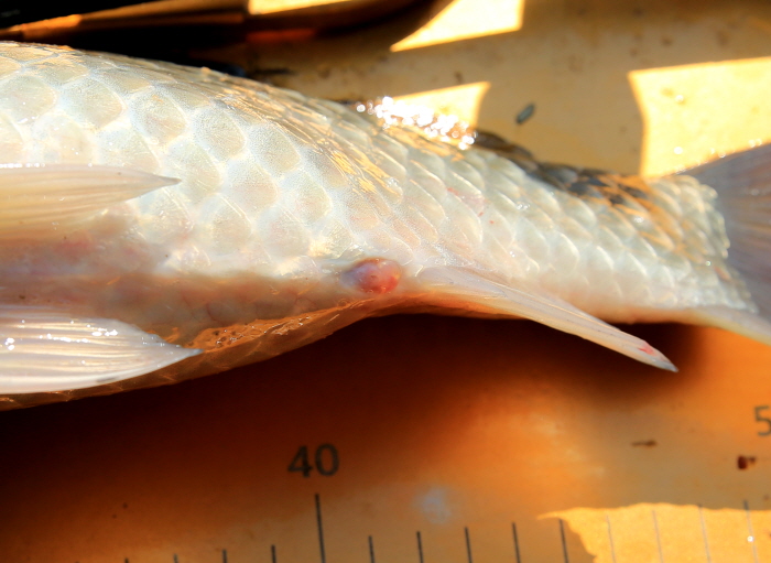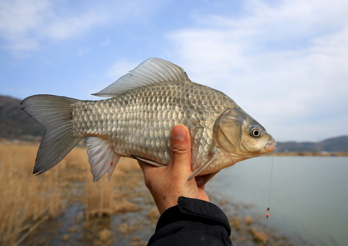 필자가 낚은 붕어. 아직 산란에 임박하지 않았지만 밤에 가끔 산란하는 붕어의 소리를 들을 수 있었다.