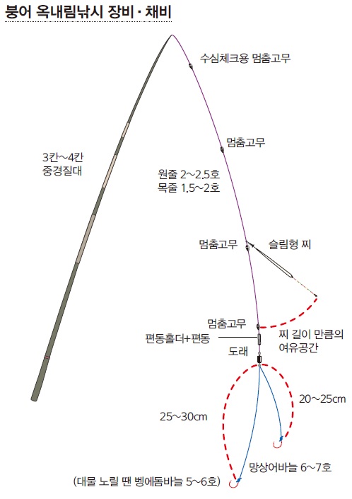 목줄은 1.5~2호를 사용하고 주로 두 가닥을 쓴다. 단차는 20~25/25~30cm가 기본이다. 밑걸림이 심한 곳에서는 바늘 하나만 쓸 수도 있다.