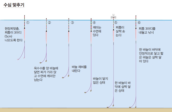 옥수수를 바늘에 달고 캐스팅한다. 정확한 수심을 찍기 위해서는 미끼에 긴 목줄의 바늘과 짧은 목줄의 바늘을 모두 꽂은 상태로 던져 넣는다. 이 경우 짧은 목줄이 기준이 될 것이다. 그리고 수심이 얕다면 찌가 벌러덩 누울 것이고 반대라면 옥수수 무게 탓에 찌가 꼬르륵~ 가라앉을 것이다. 이 상태에서 수면에서의 찌톱 높이를 위, 아래로 조절해 찌톱이 수면 위로 나오게 만든다. 찌톱이 최초 찌맞춤인 3마디를 기준으로 했을 때 3눈금보다 적게 나왔다면 (이론상)봉돌이 약간 뜬 것이고, 3마디보다 많이 나왔다면 바닥에 닿았거나 닿을랑 말랑한 상태일 확률이 높다.